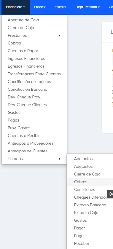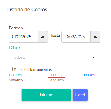 Para generar un informe de cobros, nos dirigimos a Financiero/Listados/Cobros