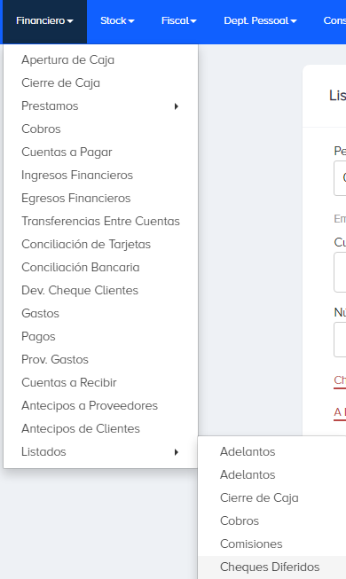 Para generar un cheque diferido, nos dirigimos a Financiero/Listados/Cheques Diferidos.