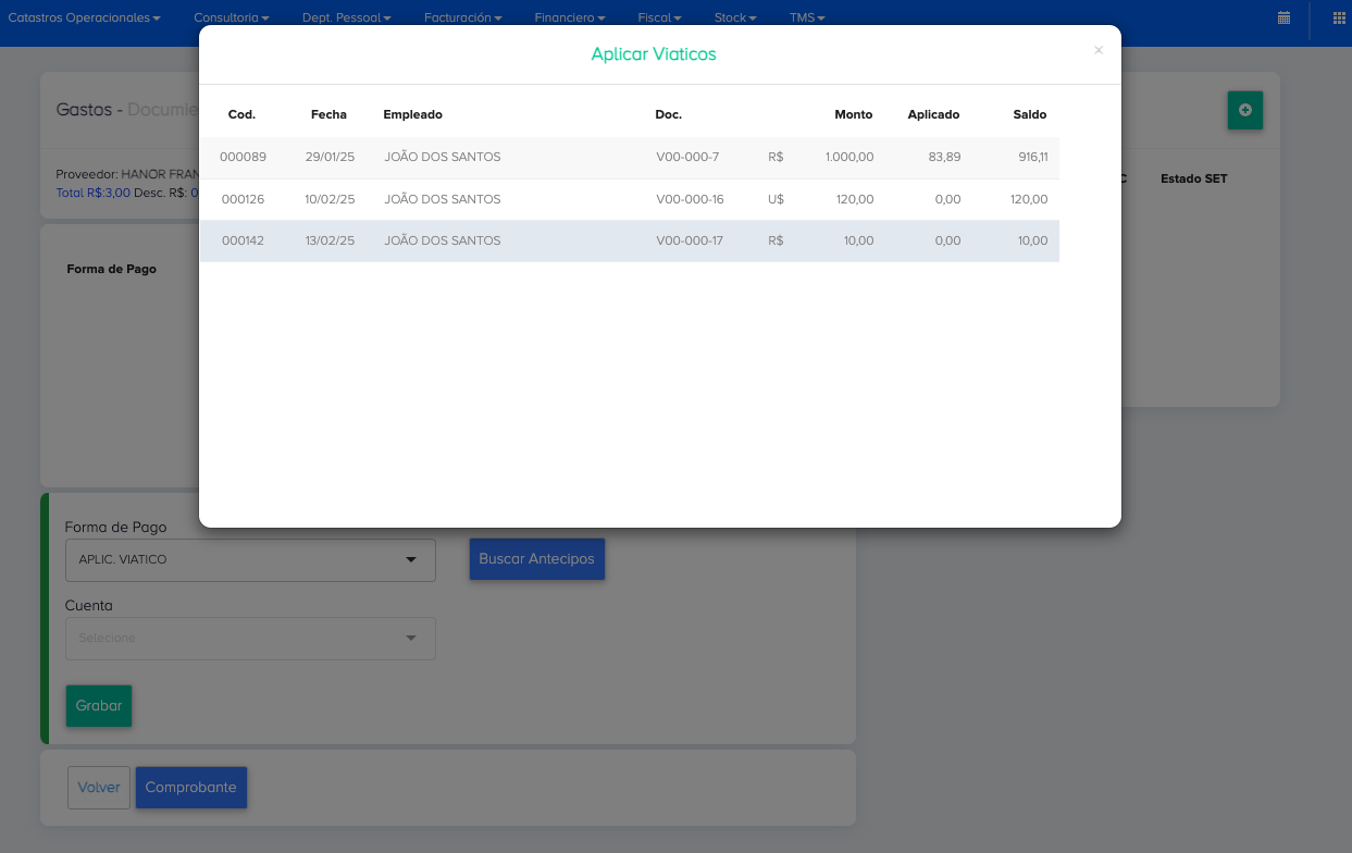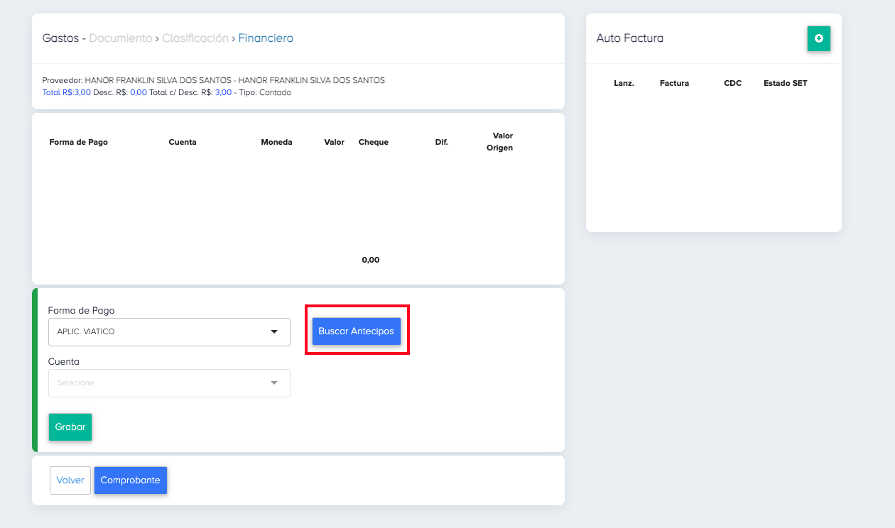 Para aplicar um viático a um gasto, você vai precisar lançar o gasto como é explicado aqui nesse artigo, na última tela aonde é informado os dados financeiro do gasto selecione a forma de pago, "APLIC. VIATICO", e aparecerá um botão "Buscar Antecipos"