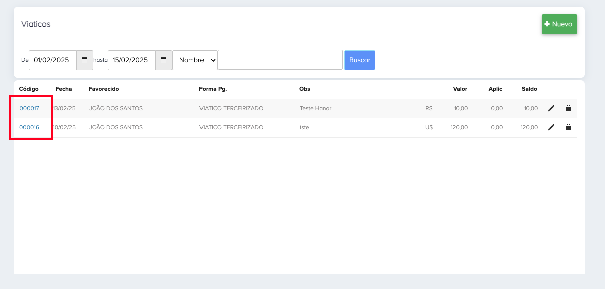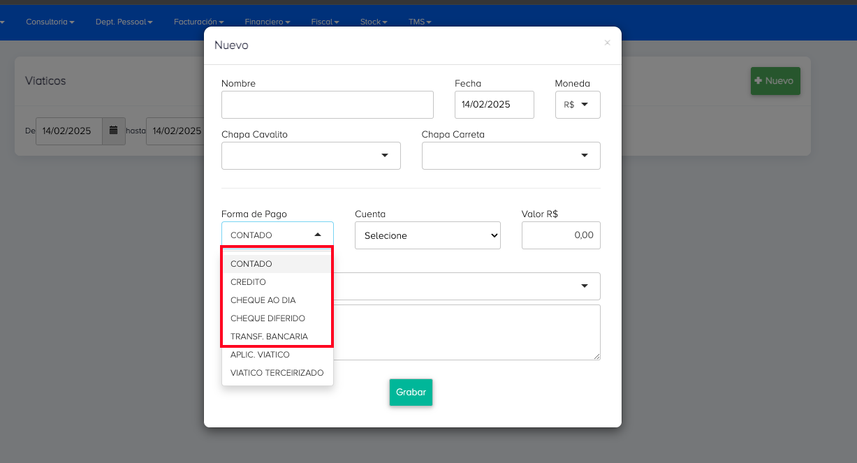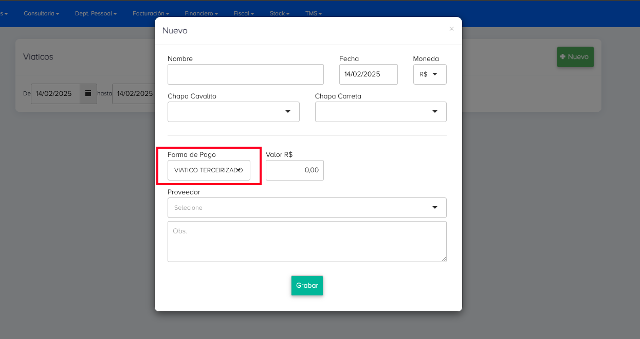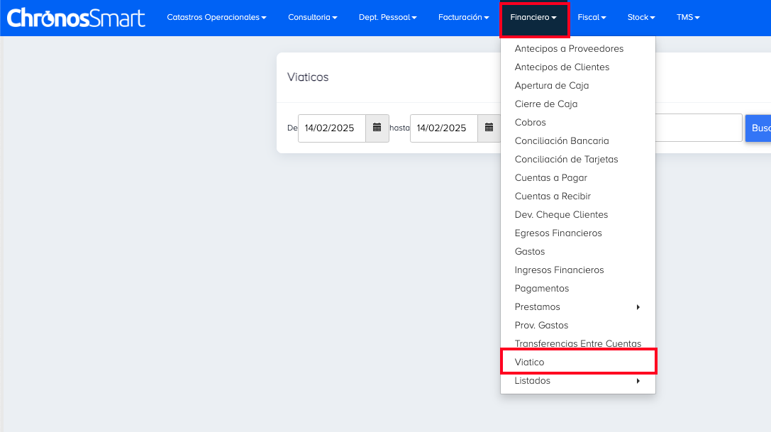 No menu principal vai em "Financeiro" depois clique em "Viatico"