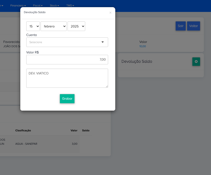 Clique no botão verde com +, e informe os dados de qual conta vai ser feita a devolução do valor, e clique em gravar.