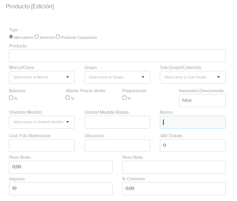 Tipo: En el caso que estemos vendiendo o comprando productos físicos, marcaremos la opción Mercadería, si estamos vendiendo servicios como(Ej: cuota mensual de cursos) entrará en la categoría servicios. Y para Producto compuesto, se usa mayormente en Restaurantes, markets para mostrar que un producto utiliza varias materias primas para su producto final(Ej: Pizzas, Hamburguesas, etc).