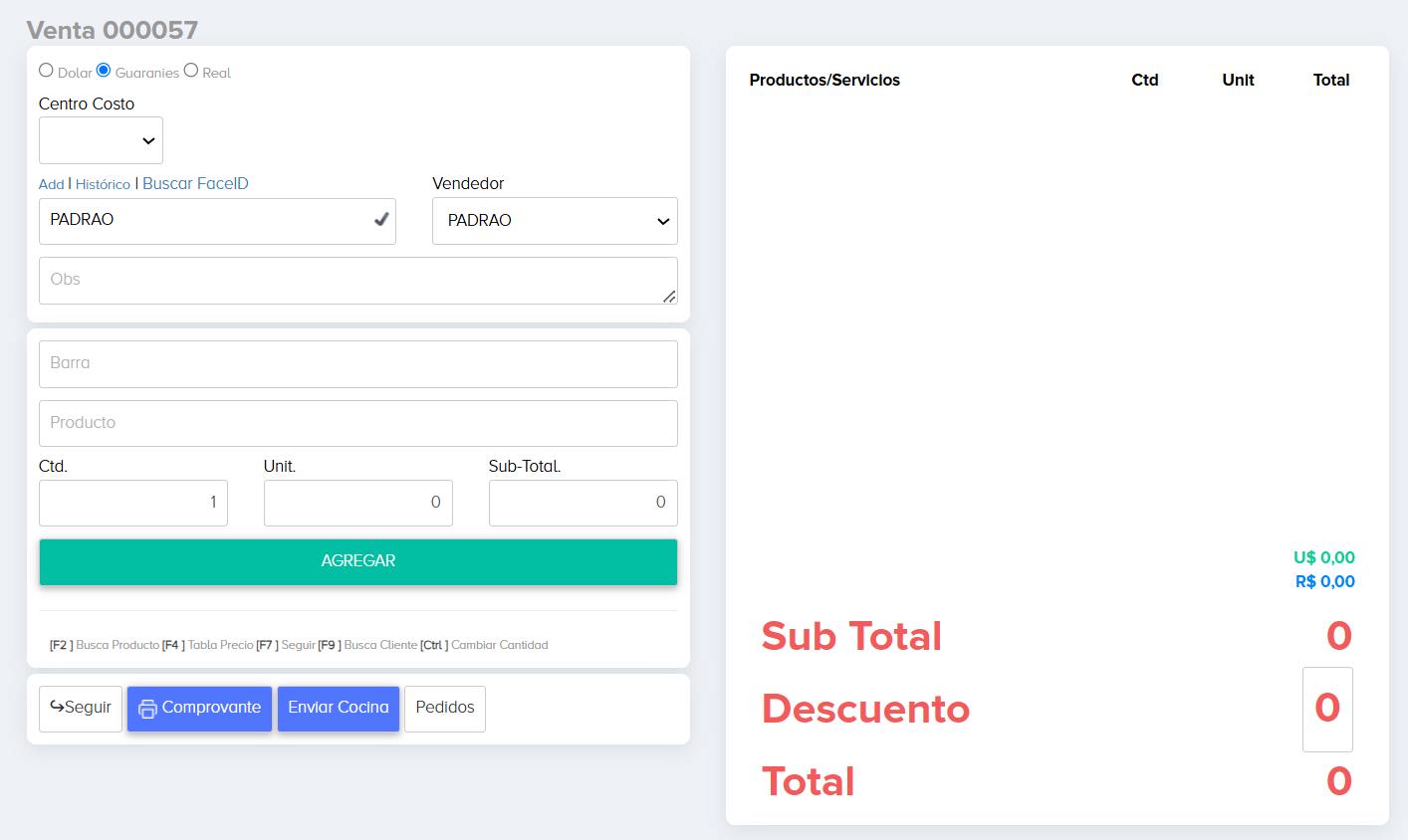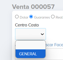 2.1- Seleccionar la moneda en la cuál será hecha la venta y en “Centro Costo” colocar la opción que te aparezca abajo.